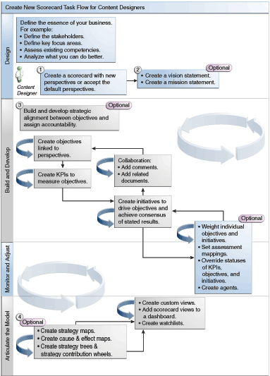 Because Oracle Scorecard and Strategy Management provides you with a wealth of scorecard objects with which to build your scorecard, an overall process flow and description is provided to guide you. It is recommended that you perform each task within the process flow in order. Figure 12-3 shows a graphic representation of the overall process flow to build a scorecard.