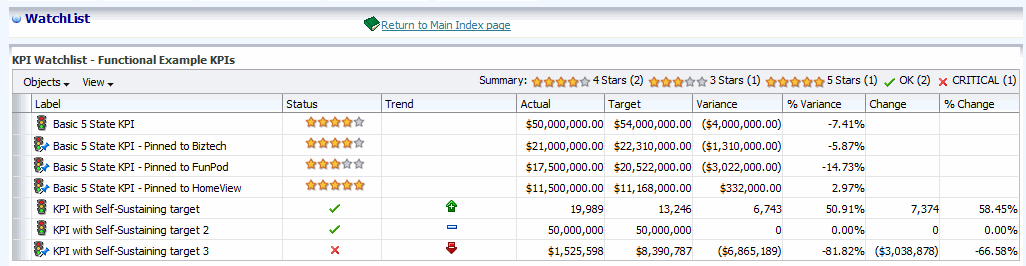 KPI watchlists are useful because you can quickly build formal or informal lists for specific uses and for specific users, or, if users are given the proper privileges, they can build their own KPI watchlists that meet their specific information needs. For example, the KPI watchlist designer might create a KPI watchlist that contains KPIs that support a specific scorecard's strategy and initiatives. Or users might create KPI watchlists to monitor their individual objectives. For example, a sales person can create a KPI watchlist that contains KPIs that monitor quarterly sales totals within a specific region. See "About Scorecard Privileges and Permissions" for additional information about Presentation Services privileges.
